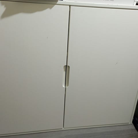 Vitt skåp med två dörrar och metallhandtag. Skåpet har justerbara hyllplan invändigt med hålrad för att kunna flytta hyllorna efter behov. Dörrarna är gångjärnsförsedda och skåpet har ett enkelt lås på ena dörren. Passar för förvaring i exempelvis hall, kontor eller förråd. Skåpet är i använt skick.
