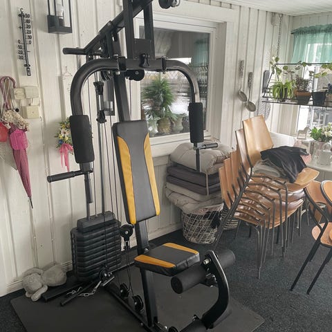Träningsstation av typen power tower i svart metall med vadderade arm- och ryggstöd. Utrustad för chins/pull-ups, dips och benlyft. Övre kabelhjul med draghandtag och rep för olika kabelövningar. Flera handtag och grepp för varierad styrketräning av överkropp, armar, rygg och mage i hemmamiljö.