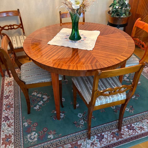 Matgrupp enl bild bra skick, lätt att klä om stolarna, iläggsskiva finns, hämtas omgående