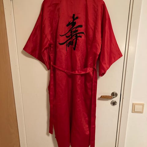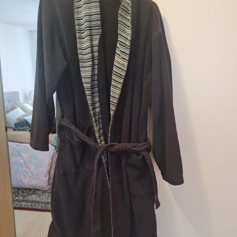 Sparsamt använd morgonrock. Mörkblå i färgen, lite lutande mot lila. Varm, mysig och trevlig.