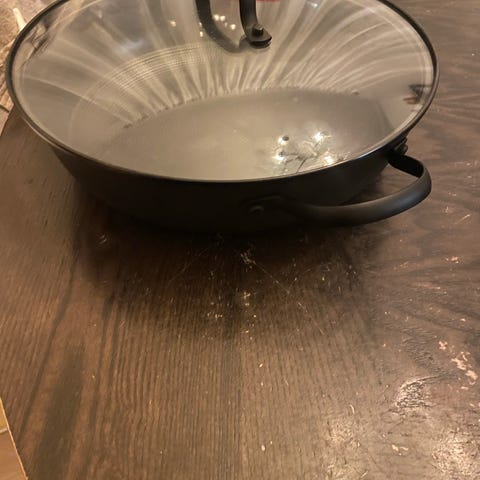 Pannan är i mycket fint skick med jämn, väl inarbetad stekyta. Inga sprickor eller skador. Fungerar på alla värmekällor inklusive induktion.
