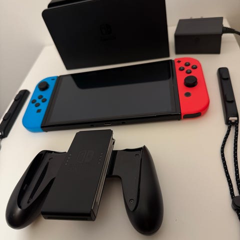 Nintendo Switch OLED 2022 spelkonsol med neonröd och neonblå Joy-Cons. Konsolen levereras komplett med dockningsstation, hdmi, strömadapter och alla original-tillbehör. En grön trådbunden (3m) PowerA handkontroll med Yoshi-motiv ingår, samt en hård förvaringsväska Game Traveler Deluxe System Case med plats för konsol, docka och alla tillbehör. Systemet är avsett för spel både i handhållet läge och anslutet till tv via dockan.