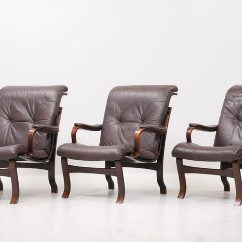 Retro skinnsoffa 3-sits i brunt skinn & betsad bok/böjträ från 1970-tal i fint skick se bilder.