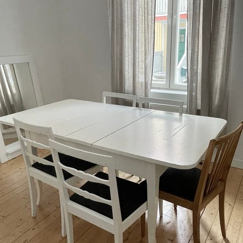 Ett mycket fint matbord med iläggsskiva och fyra välskötta stolar. Kommer från ett rök-och djurfritt hem. Säljes i befintligt skick. Hämtas senast lördag 28/2.