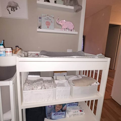IKEA väggmonterat skötbord i vitt. Skötbordet fälls ner från väggen och har en skötbädd på insidan. Ovanför skötytan finns öppna hyllplan för förvaring av blöjor, kläder och andra tillbehör. När skötbordet är uppfällt tar det liten plats i rummet. Passar för barn i blöjålder enligt tillverkarens rekommendationer och ska monteras stadigt i vägg enligt anvisningar.