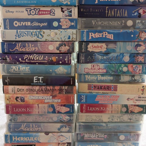 Säljer nu sex stycken älskade Disney-klassiker på VHS. Perfekt för samlaren eller för dig som vill återuppleva nostalgins magi med barnen! Samtliga filmer har svenskt tal och originalfodral.