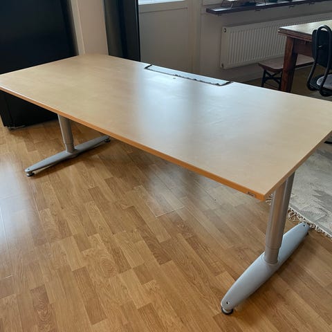 Stabil metallstomme och kraftig bordsskiva. Gott om plats för skärmar, dator och arbetsmaterial. Bordet är i jättebra skick, jätte lite slitage