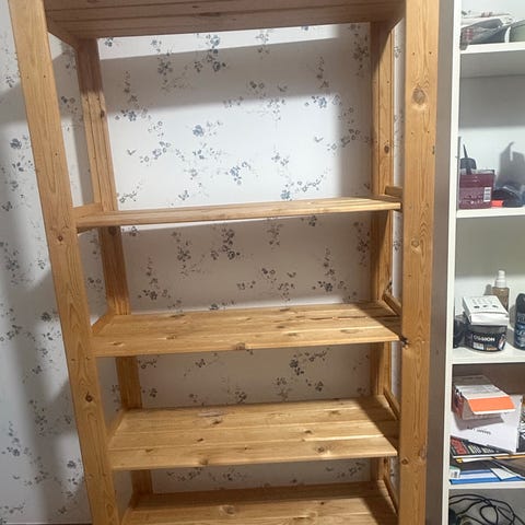 Säljer en fin och stabil bokhylla i massivt trä (furu).