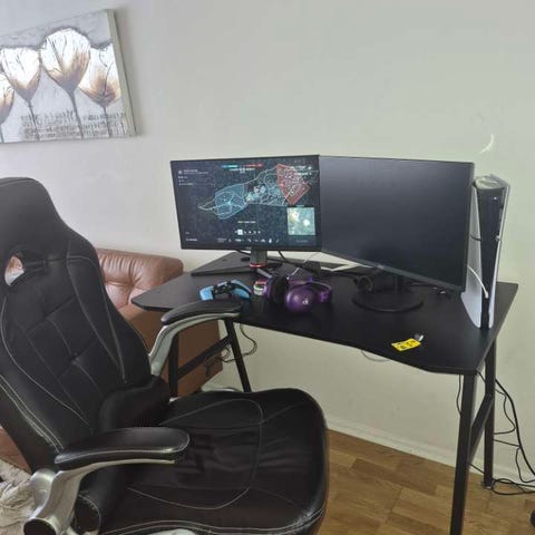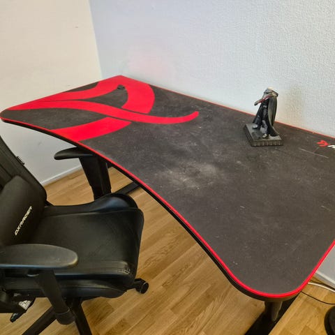 Gamingstol i svart och röd färg, tillverkad i konstläder. Stolen har hög rygg med hål för ventilation, justerbara armstöd samt nackkudde och svankkudde med remmar på baksidan. Sitsen är vadderad med rutmönster och stolen står på ett femarmat hjulkryss. Lämplig som kontors- eller gamingstol vid skrivbord och datoranvändning. Pris 800kr
