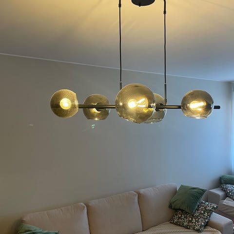 CO bankeryd taklampa med 9 ljuskällor. Lampan har rökfärgade glaskupor och stomme i mässingsfärgad metall. Passar som allmänbelysning i exempelvis vardagsrum, matplats eller sovrum. Ordinarie pis 4999