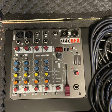 Alto S-6 mixerbord med flera kanaler och separata reglage för nivå, EQ och aux. Utrustad med XLR-ingångar för mikrofon, linjeingångar med 6,3 mm telekontakter samt RCA-ingångar och -utgångar. Panel med LED-indikering för nivåer och huvudutgång. Passar för enklare ljudmixning i till exempel hemstudio, replokal eller mindre live-sammanhang.