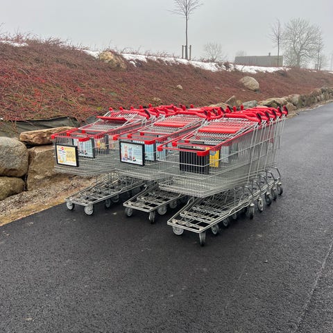 Städvagn i metall med flera korgar och hållare. Utrustad med röd hink, mindre behållare, två tvättpåsar i nät (röd och blå) samt extra förvaringskorgar och hyllplan. Vagnen har hjul för enkel förflyttning och handtag baktill. Lämplig för städning i exempelvis kontor, skolor eller andra lokaler där material behöver transporteras mellan olika utrymmen.