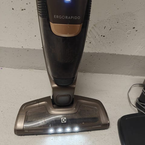 Sladdlös dammsugare från Electrolux. Nån fläck och lite skav. Nån slitning, se bild. Funkar som den ska. Går att ta av ena delen och få en handdammsugare, ingår ett extra munstycke med en borste till den delen.