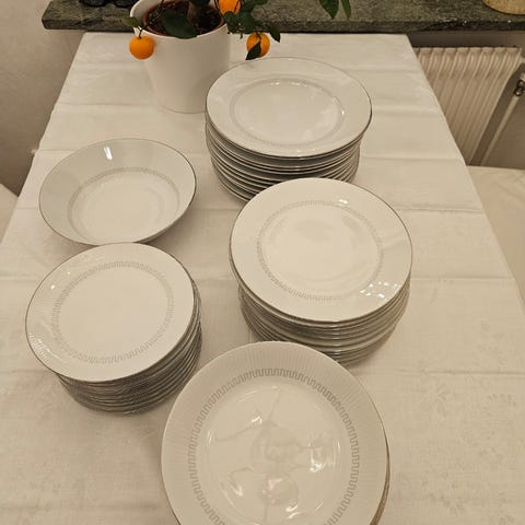 Seltmann Weiden porslinservis i vit färg med guldfärgade dekorränder och kanter. Servisen består av 12 koppar med fat samt sex tallrikar, sockerskål med lock och gräddkanna. Tillverkad i porslin, lämplig för servering av kaffe, te och dessert. Dekoren är diskret randig med gulddetaljer på kanter och handtag.