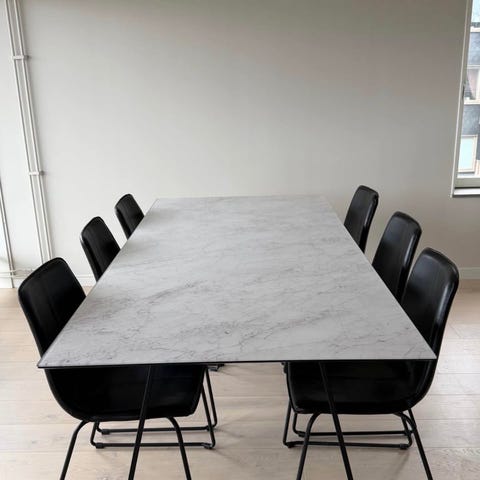 Vit matgrupp med iläggsskiva. Sex stolar från Mio. Ett litet märke I bordsskivan och ett på ena bordsbenet. 190 cm utan iläggsskiva