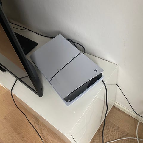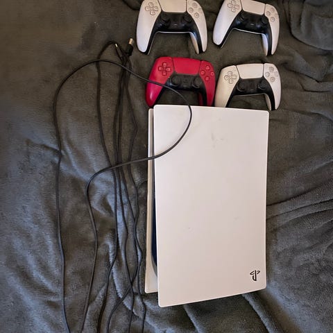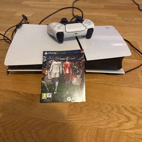 Sony Playstation 5 spelkonsol i vit färg. Konsolen på bilden är standardmodellen med skivläsare och står vertikalt på ett underlag. En trådlös handkontroll (DualSense) i vit och svart färg syns bredvid konsolen. Lämplig för spel, streaming och underhållning i hemmet med stöd för moderna TV-apparater och bildskärmar.