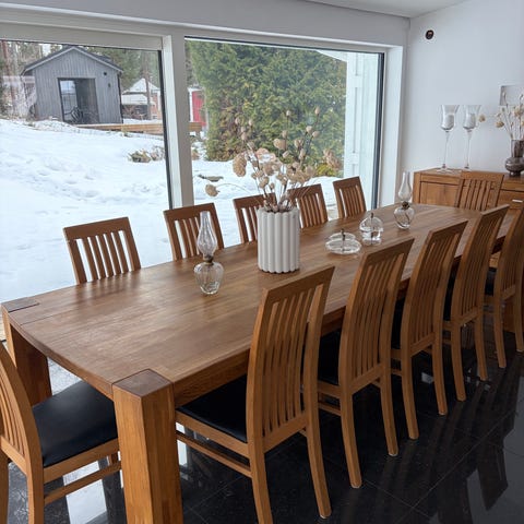 OBS! Möblemanget är väl använt och det finns märken och avtryck efter år av middagar och vardagsliv. Samtidigt är det just det som ger charm – och eftersom det är massivt ek finns fantastiska möjligheter att slipa om ytan och få det att se nästan som nytt ut igen för den som vill.