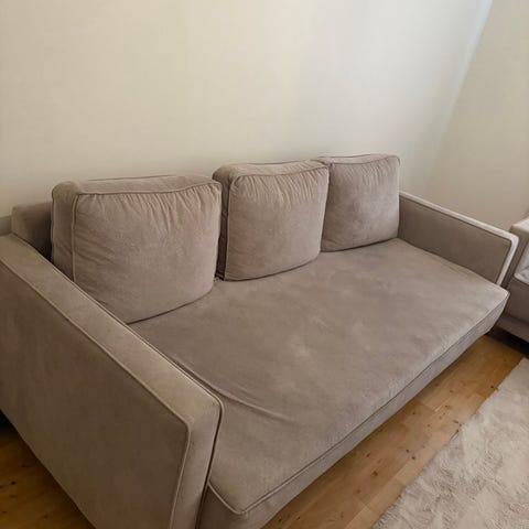Efter flytt kom vår nya soffa tidigare än förväntat och vi behöver därför bli av med denna. Det finns fläckar på sitsen som säkert kan behandlas med möbeltvätt.