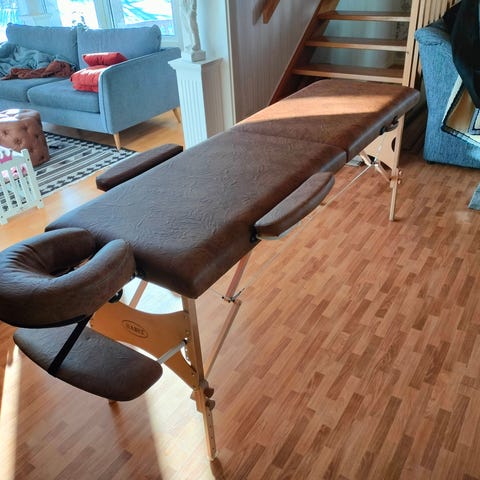 Hopfällbar massagebänk i svart konstläder med justerbara aluminiumben. Bänken har justerbar stöd för ben eller rygg, ansiktshål i liggytan samt avtagbart ansiktsstöd. Sidostöd/armstöd och underarmsstöd ingår. Levereras med svart bärväska för enklare transport och förvaring. Lämplig för massage, behandlingar och annan kroppsvård.