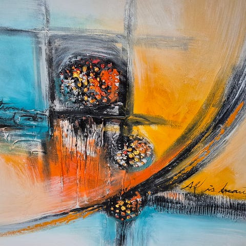 Abstrakt oljemålning med geometriska former och färgfält. Målningen har en blandning av varma och kalla toner, inklusive blått, gult, rött och brunt. Den är monterad på en träram och redo att hängas upp. 70x100cm