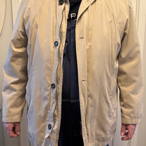 Monson rock för herr i storlek 48. Rocken är grå och har yttertyg i polyesterblandning (65 % polyester, 35 % bomull), med foder i 100 % nylon och fyllning i 100 % polyester. Modellen har längre längd, framfickor med lock samt ärmavslut med enkel manschett. Plagget är tillverkat i Korea och kan tvättas i 40 grader enligt tvättråden. Passar som ytterplagg i svalare väder.
