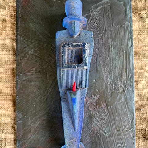 Smidesskulptur med grönt glas troligen av kände Gunnar Ander.