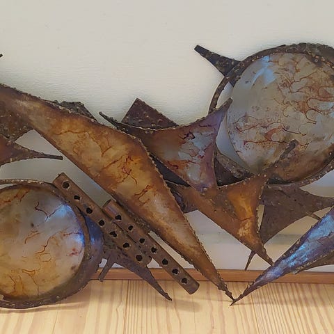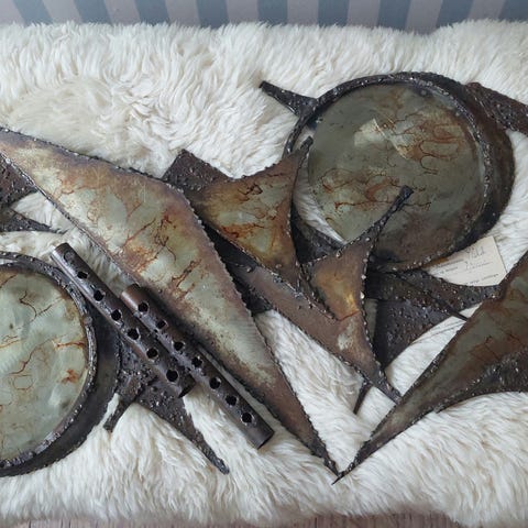 Väggskulptur i svart metall med geometriska former och grönt tjockt vackert glas. Trolig formgivare Gunnar Ander.