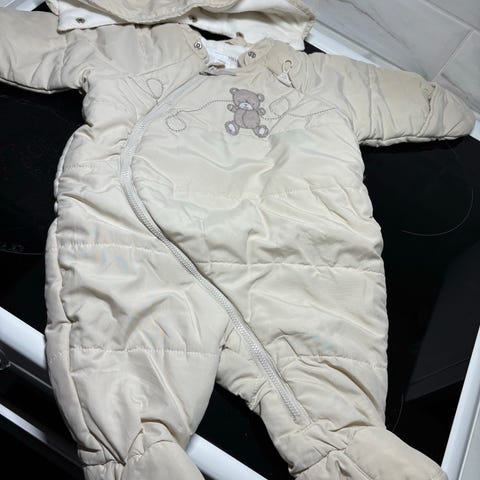 En vadderad overall för baby med huva och dragkedja framtill. Overallen har inbyggda fötter för extra värme och skydd. Den är designad för att hålla barnet varmt och bekvämt. Använd sparsamt, från ett djur och rökfritt hem.