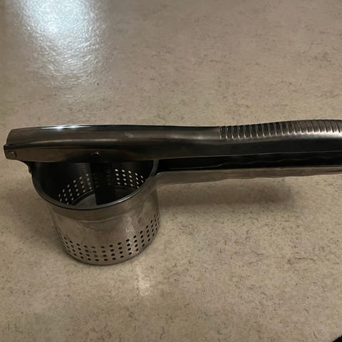 potatispress i metall. Handhållen press med perforerad korg för att pressa kokt potatis eller andra mjuka livsmedel. Tillverkad i metall med två handtag och gångjärn för enkel pressning. Lämplig för användning i kök vid matlagning där finfördelad potatis eller rotfrukter önskas.