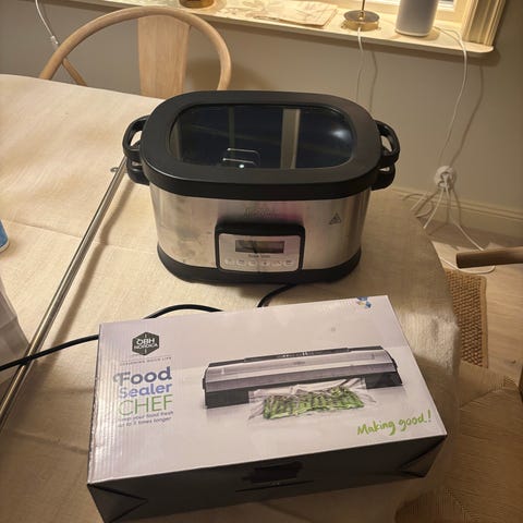 Champion sous vide-cirkulator för precisionsmatlagning i vattenbad. Enheten fästs på en kastrull eller behållare och cirkulerar vattnet för jämn temperatur. Digital display visar aktuell temperatur och timer. Lämplig för tillagning av kött, fisk, grönsaker och andra råvaror vid kontrollerad låg temperatur.
