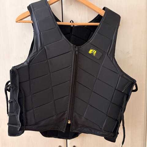 Racesafe säkerhetsväst i svart. Västen har kvadratiskt vadderade paneler framtill och längsgående paneler baktill för stötdämpning och skydd. Dragkedja framtill samt snörning i sidorna för justerbar passform. Insidan är ljusare fodrad. Endast använd vid tävlan och är godkänd för sådan (Level 3, CE-märkt och enligt europeisk standard EN 13158).