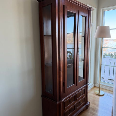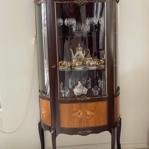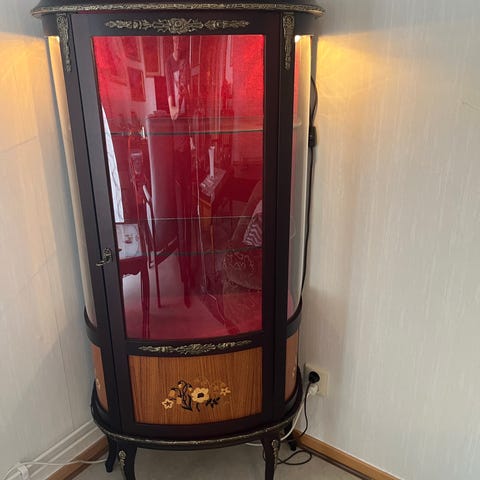 Famos vitrinskåp i trä med glasskåp och glashyllor med träram, finns även belysning i den.