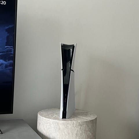 Sony Playstation 5 spelkonsol i vit färg. Konsolen är avsedd för hemmabruk och ansluts till TV eller skärm via HDMI. Modellen stödjer moderna spel med hög upplösning och erbjuder lagringsutrymme för installation av spel och appar. En trådlös handkontroll i matchande färg ingår enligt bilden. Lämplig för användning med kompatibla Playstation 5-spel och tillbehör.