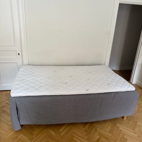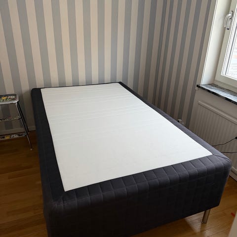 IKEA säng med förvaring i vit färg. Sängen är utrustad med utdragslådor under liggytan som ger extra förvaringsutrymme för till exempel sängkläder eller kläder. Madrass och bäddmadrass syns på bilderna. Passar som enkelsäng i sovrum, gästrum eller tonårsrum.