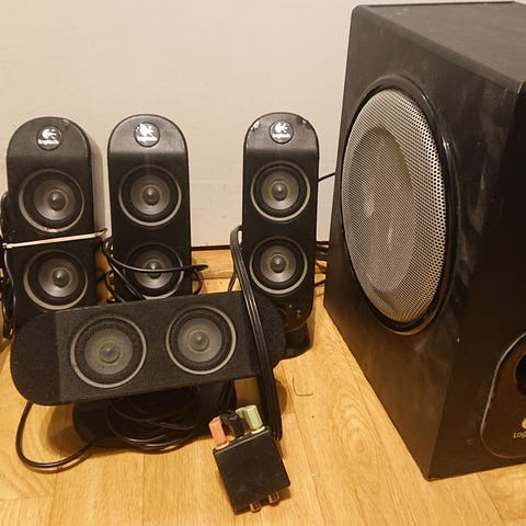 Logitech högtalarsystem med subwoofer i svart färg. Systemet består av flera satellithögtalare, en centerhögtalare och en aktiv subwoofer. Passar för användning med dator, TV eller annan ljudkälla via kabelanslutning.