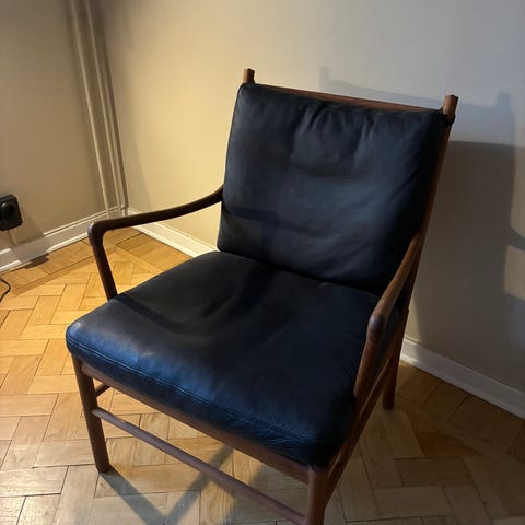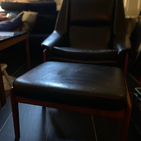 Skinnfåtölj med fotpall, design Folke Olsson. Lutning på fåtölj och fotpall går att reglera.