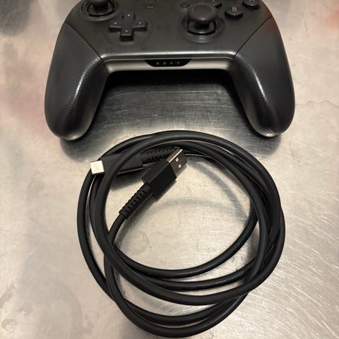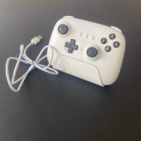 Säljer en vit 8BitDo-kontroll med tillhörande laddstation. Allt fungerar som det ska.