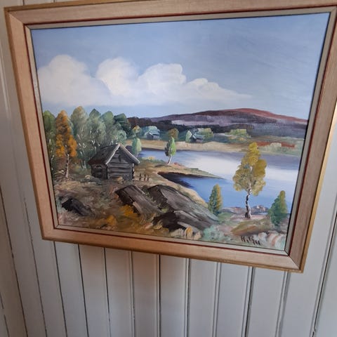 Tavla med målat landskapsmotiv föreställande sjö, skog och ett rött trähus vid en väg. Målningen är monterad i en träram med ljus front och mörkare innerkant. Baksidan har kvar delar av en äldre etikett. Passar som väggdekoration i exempelvis vardagsrum, hall eller sovrum.