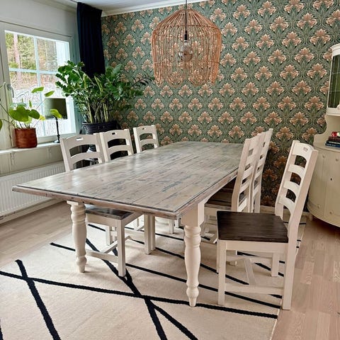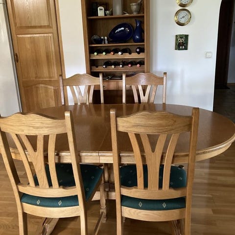 Bord och 6 stolar i massiv björk +2 st iläggsskivor a 50 cm .