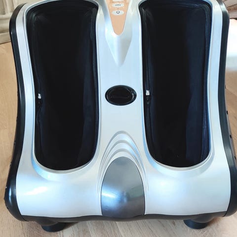 VitalPlus fotmassageapparat med digital display. Apparaten har två fotplattor med halkskyddande ytor och en central enhet med knappar för styrka och programval. LCD-displayen visar inställd tid och nivå. Produkten är avsedd för elektrisk stimulering och massage av fötter vid användning i hemmet. Drivs via nätström enligt tillverkarens anvisningar.