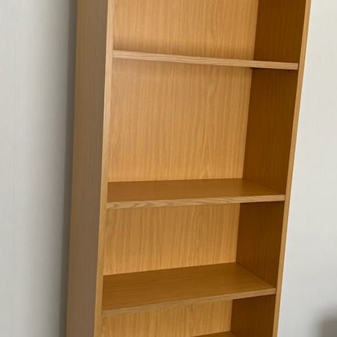 Brun men ljusare än bilden med flera fasta hyllplan. Passar för förvaring av böcker, pärmar eller annan förvaring i vardagsrum, kontor eller förråd. Fristående modell som placeras mot vägg.
