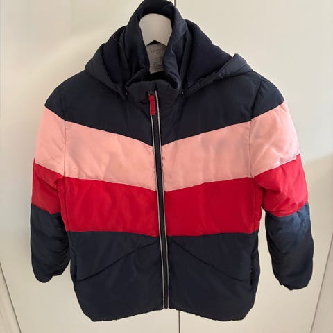 Vinterjacka med luva och dragkedja framtill. Jackan har två fickor i midjehöjd och "HILFIGER" tryckt på luvan. Stlk 152.
