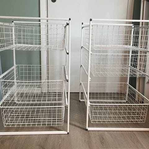 Säljer ett stabilt och praktiskt Elfa backstativ i vitt med toppskiva. Perfekt för förvaring i klädkammare, hall, förråd eller kontor.