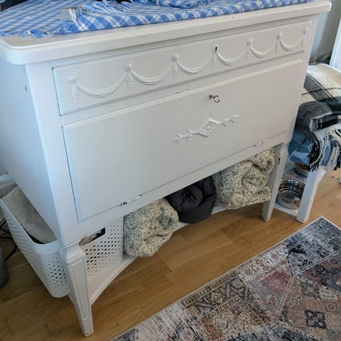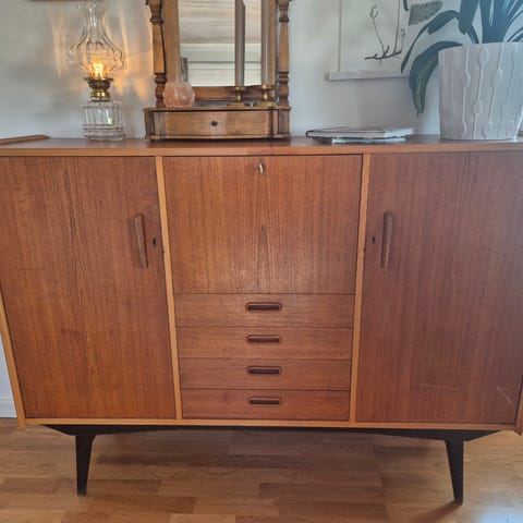 Sideboard/linneskåp i trä med skjutdörrar och hyllor