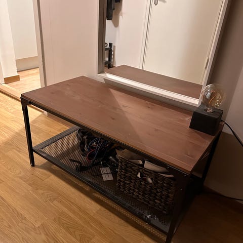 Soffbord Fjällbo Ikea massivt trä och metall, höjd 46cm, längd 90cm, bredd 46cm, fint skick.