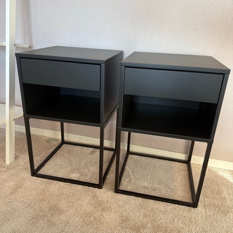 Sängbord med en hylla och en stor låda.