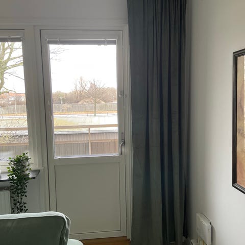 Vi flyttar till mindre och säljer mörkläggningsgardiner sydda med Designers Guild tyg, sedan sydda med mörkläggningstyg på baksidan, allt av en sömmerska.