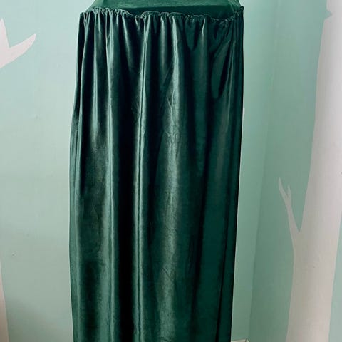 En ljusgrön/grå sänghimmel i tungt ljockt sammests liknande tyg. Knappt använd.