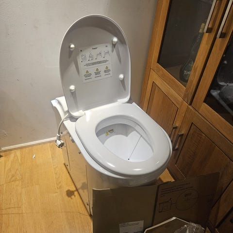 Cindi Family förbränningstoalett i. Toaletten är avsedd för installation i exempelvis fritidshus eller andra utrymmen utan traditionellt avlopp. På ovansidan finns digital display och reglage för val av program. Produkten levereras med bruksanvisning och tillbehör som rengöringsborste enligt bilden. Toaletten ansluts till el och förbränner avfallet till aska, vilket minskar behovet av vatten och avloppsanslutning. Använd i fjällstuga några veckor om året köpt -22