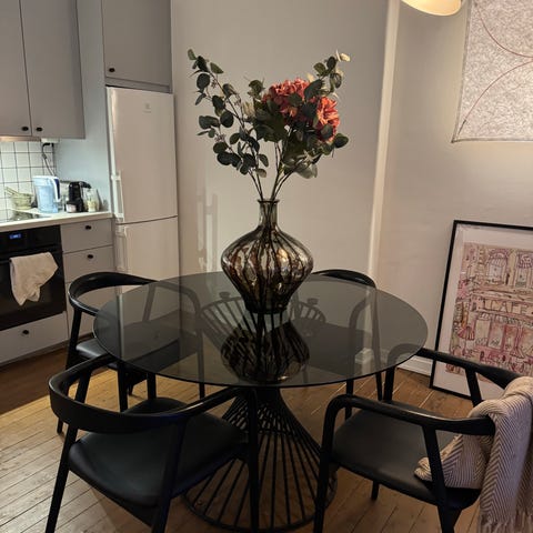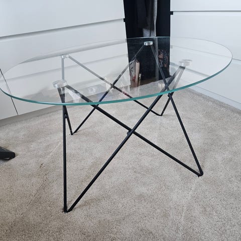 Ett gediget designbord med oval glasskiva och marmorfot.